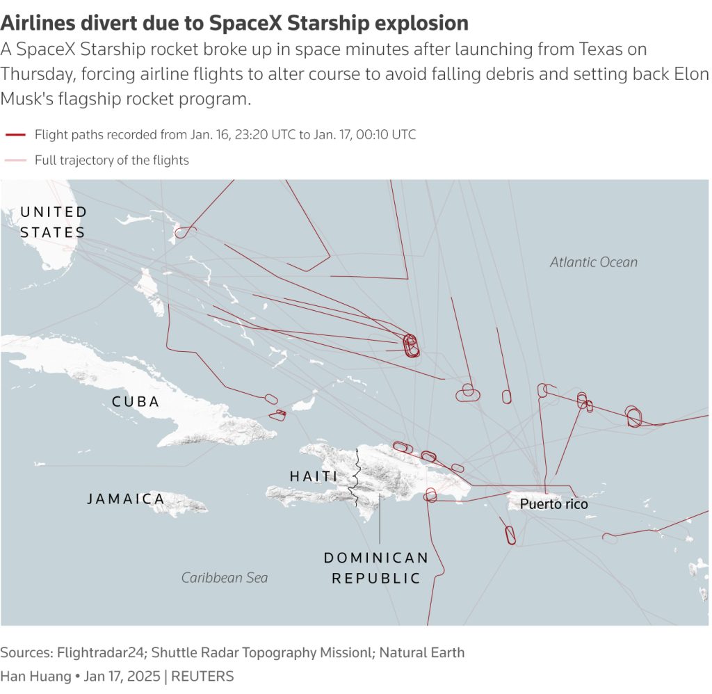 In one notable incident, SpaceX’s Starship Flight 7 exploded in mid-air, scattering rocket debris in the sky. The FAA issued an immediate safety alert to aviation companies, warning pilots to reroute or delay flights until the airspace could be cleared of debris.